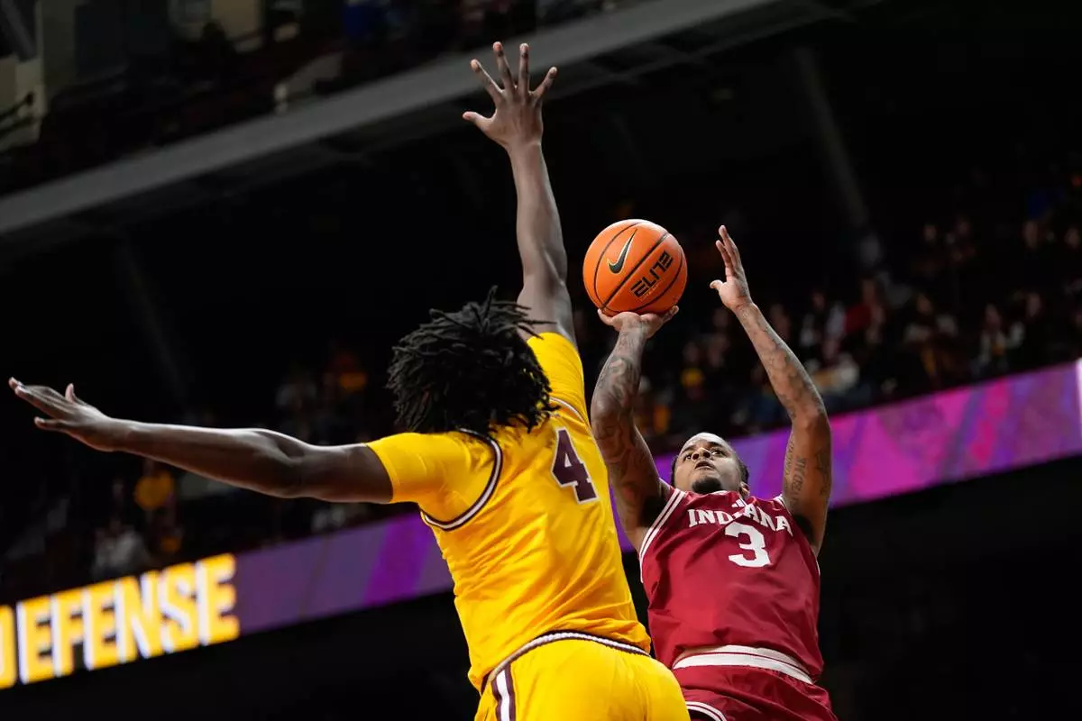 Indiana guard Lamar Wilkerson (3) shoots over Minnesota forward Nehemiah Turner (4) during the second half of an NCAA college basketball game Wednesday, Dec. 3, 2025, in Minneapolis. (AP Photo/Abbie Parr)
