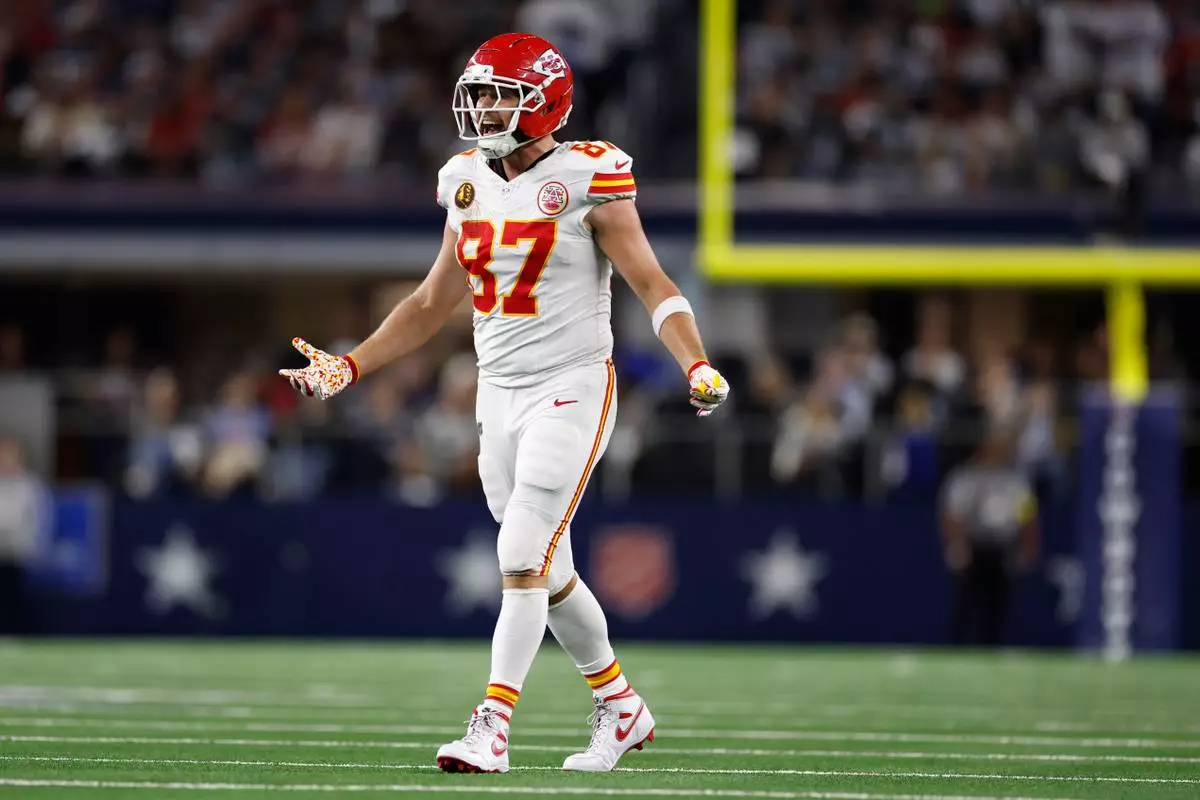 Kansas City Chiefs tight end Travis Kelce reacts during the second half of an NFL football game against the Dallas Cowboys Thursday, Nov. 27, 2025, in Arlington, Texas. (AP Photo/Gareth Patterson)