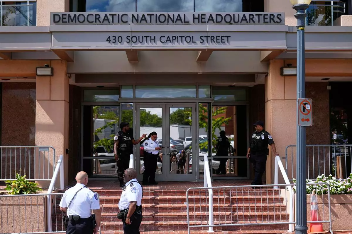 FILE - Members of law enforcement are pictured outside Democratic National Committee headquarters, Sept. 11, 2025, in Washington. (AP Photo/Mark Schiefelbein, File)