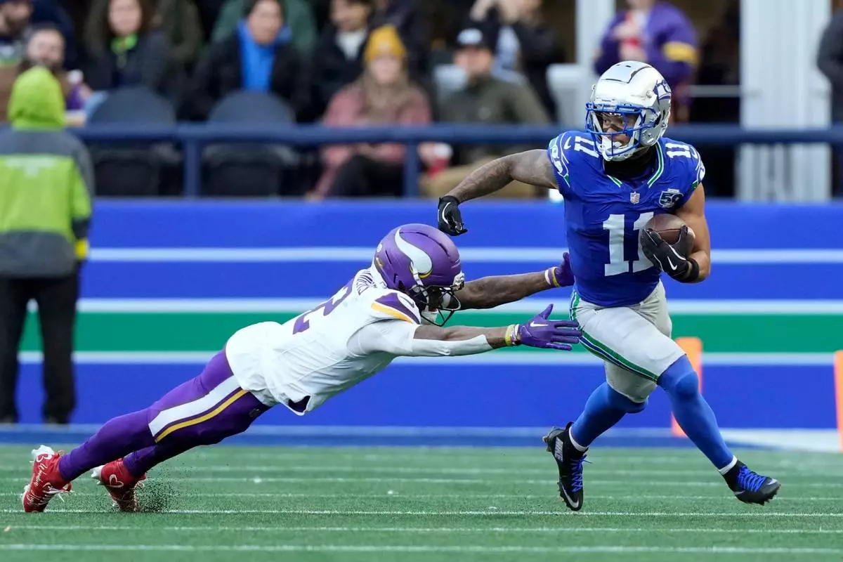 Seattle Seahawks wide receiver Jaxon Smith-Njigba (11) runs against Minnesota Vikings cornerback Isaiah Rodgers (2) during the second half of an NFL football game Sunday, Nov. 30, 2025, in Seattle. (AP Photo/Stephen Brashear)
