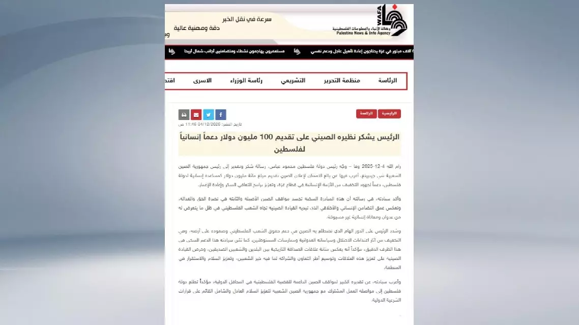 Abbas emphasized that this generous donation reflects the solid friendship between the two countries and their people, as well as China's commitment to justice and fairness. It also demonstrates the care and support of the Chinese leadership for the Palestinian people, and China's commitment to strengthening the strategic partnership and cooperation between the two countries to benefit the people of both countries and promote regional peace and stability.