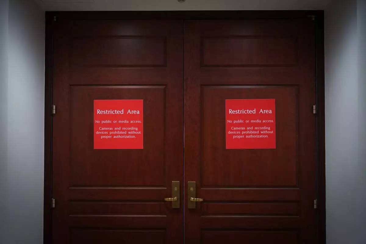The closed entrance to a secure room is seen where Navy Adm. Frank "Mitch" Bradley, commander of the U.S. Special Operations Command, is expected to brief top congressional lawmakers overseeing national security as they investigate how Defense Secretary Pete Hegseth handled a military strike on a suspected drug smuggling boat and its crew in the Caribbean near Venezuela Sept. 2, at the Capitol in Washington, Thursday, Dec. 4, 2025. (AP Photo/J. Scott Applewhite)