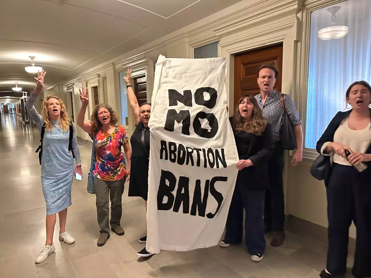 Abortion-rights activists protest in the Missouri Capitol on May 14, 2025, in Jefferson City, as the state Senate approves a proposed constitutional amendment to restrict abortion. (AP Photo/David A. Lieb)