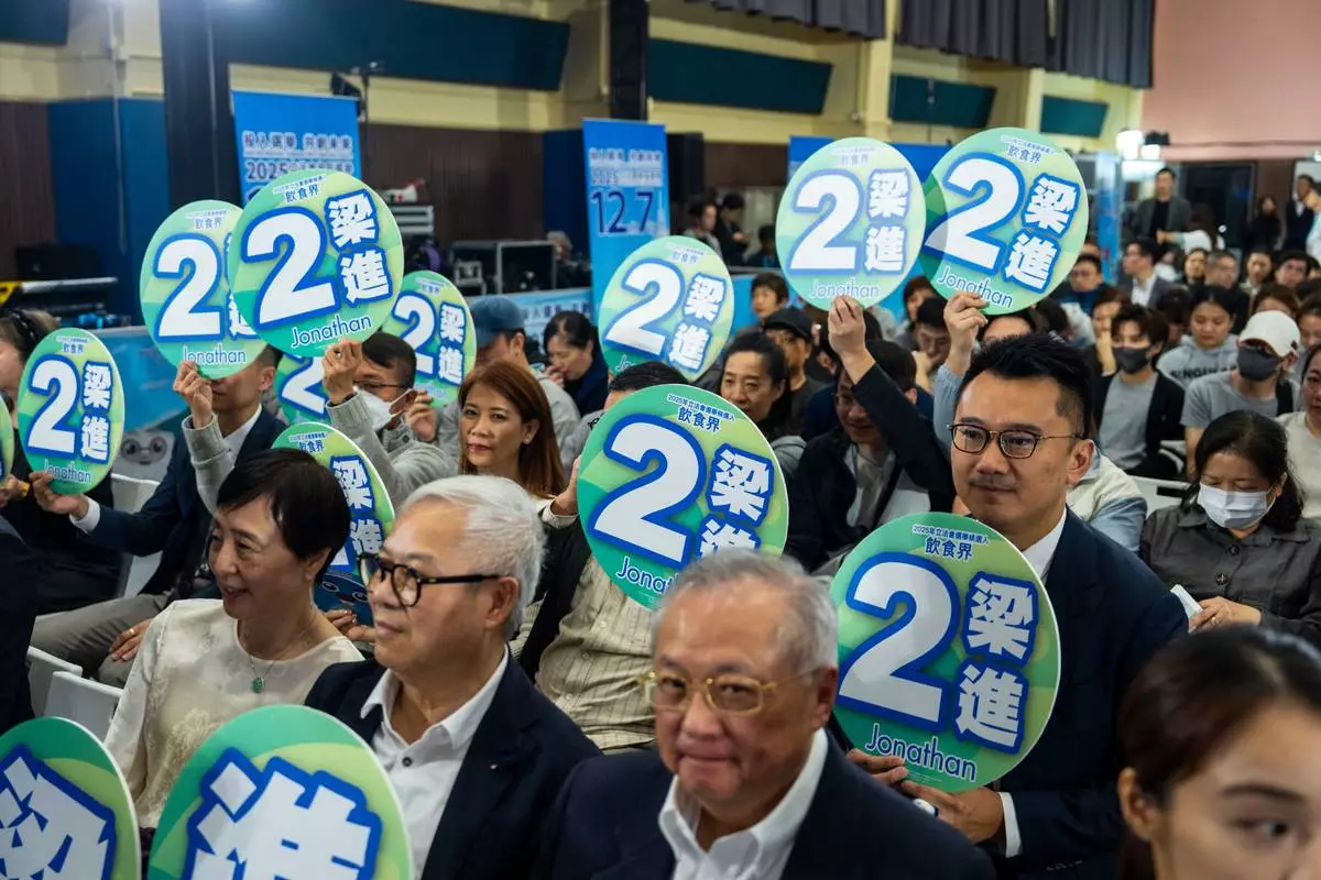 Supporters of Jonathan Leung, candidate of the Legislative Council Catering functional constituency election, hold placard at a forum in Hong Kong on Wednesday, Dec. 3, 2025. (AP Photo/Chan Long Hei)