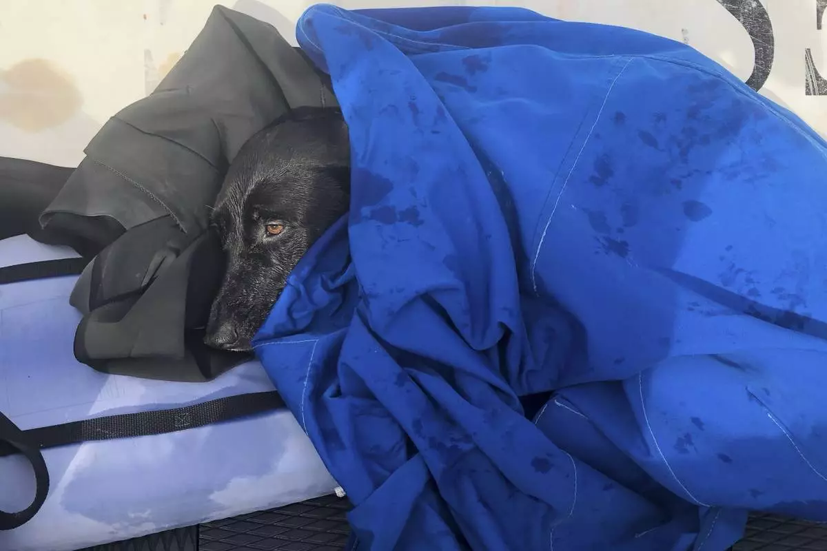 This photo released by San Diego Fire-Rescue shows Sadie, a black Labrador retriever-mix, on a lifeguard boat heading to shore after being rescued from the water near Mission Beach, San Diego, Nov. 23, 2025. (San Diego Fire-Rescue via AP)