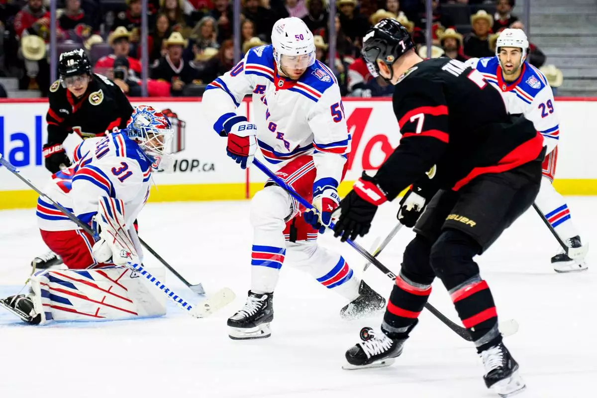 New York Rangers goaltender Igor Shesterkin, left, makes a save against Ottawa Senators' Nick Cousins (21) as Rangers' Scott Morrow (60) defends during second-period NHL hockey game action in Ottawa, Ontario, Thursday, Dec. 4, 2025. (Spencer Colby/The Canadian Press via AP)