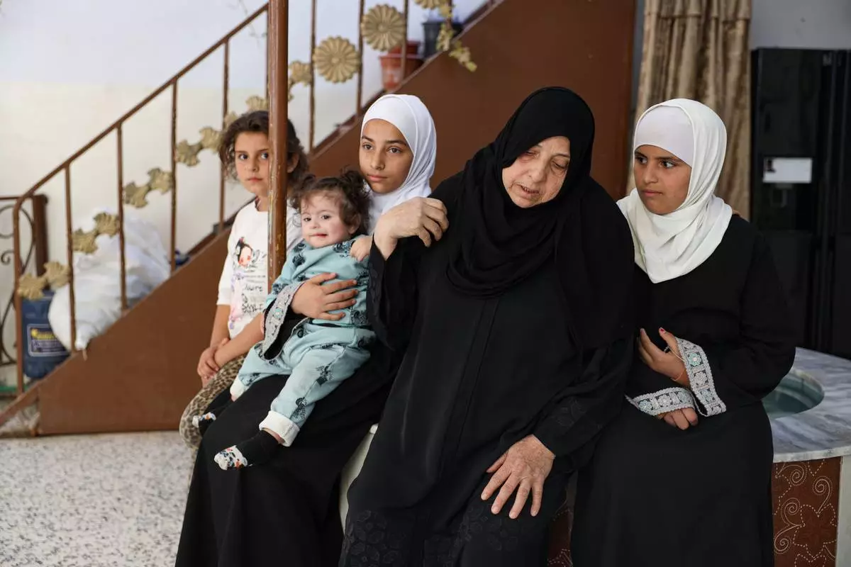 Sabah al-Sheikh al-Kilani, the mother of Khaled al-Masoud, sits with several of his daughters at the family home after he was killed during a raid in the town of al-Dumayr, in the Damascus countryside, Syria, Oct. 28, 2025. (AP Photo/Omar Albam)