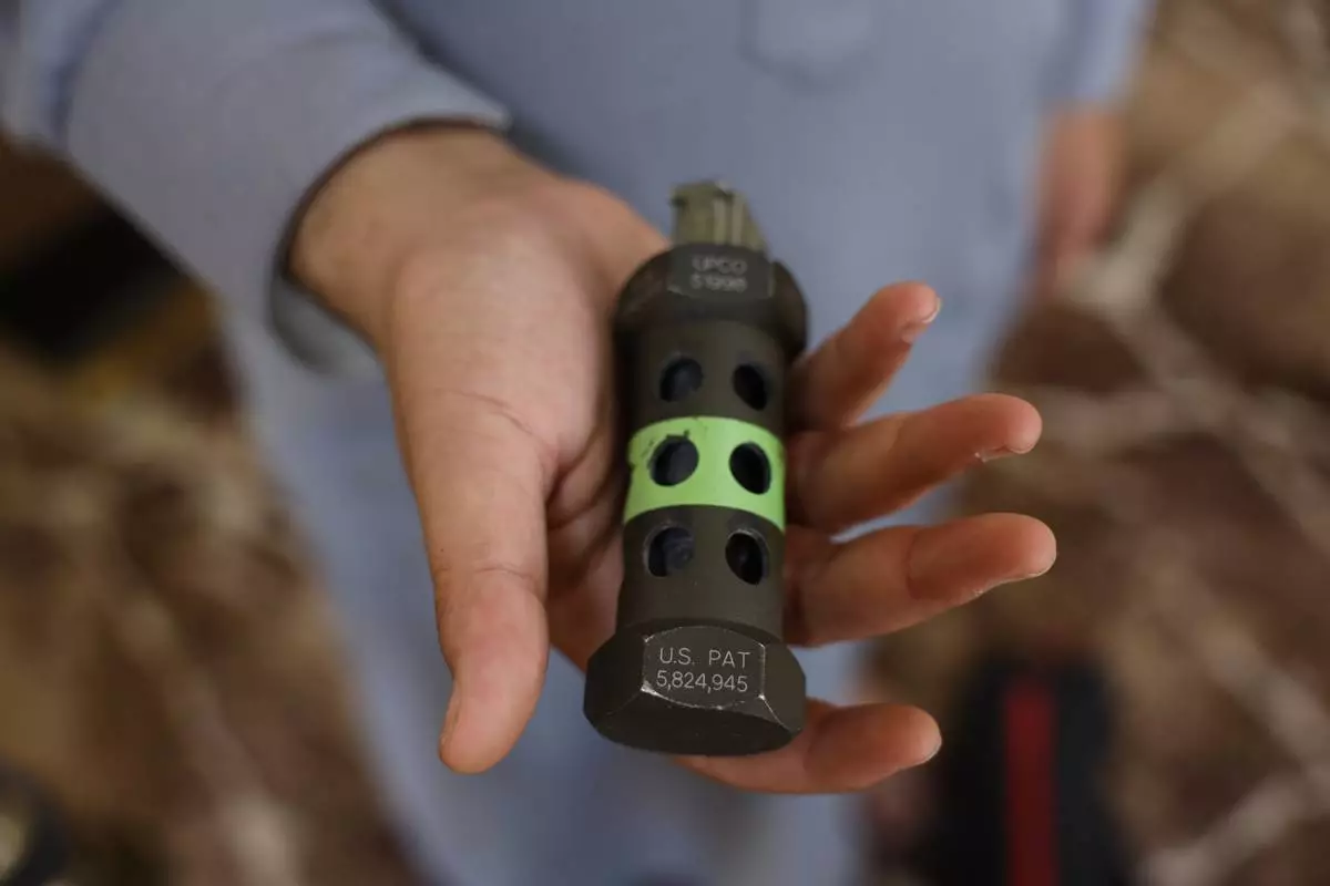 A relative of Khaled al-Masoud holds a piece of a munition said to have been used in the raid that killed him, in the town of Dumayr, in the Damascus countryside, Syria, Oct. 28, 2025. (AP Photo/Omar Albam)