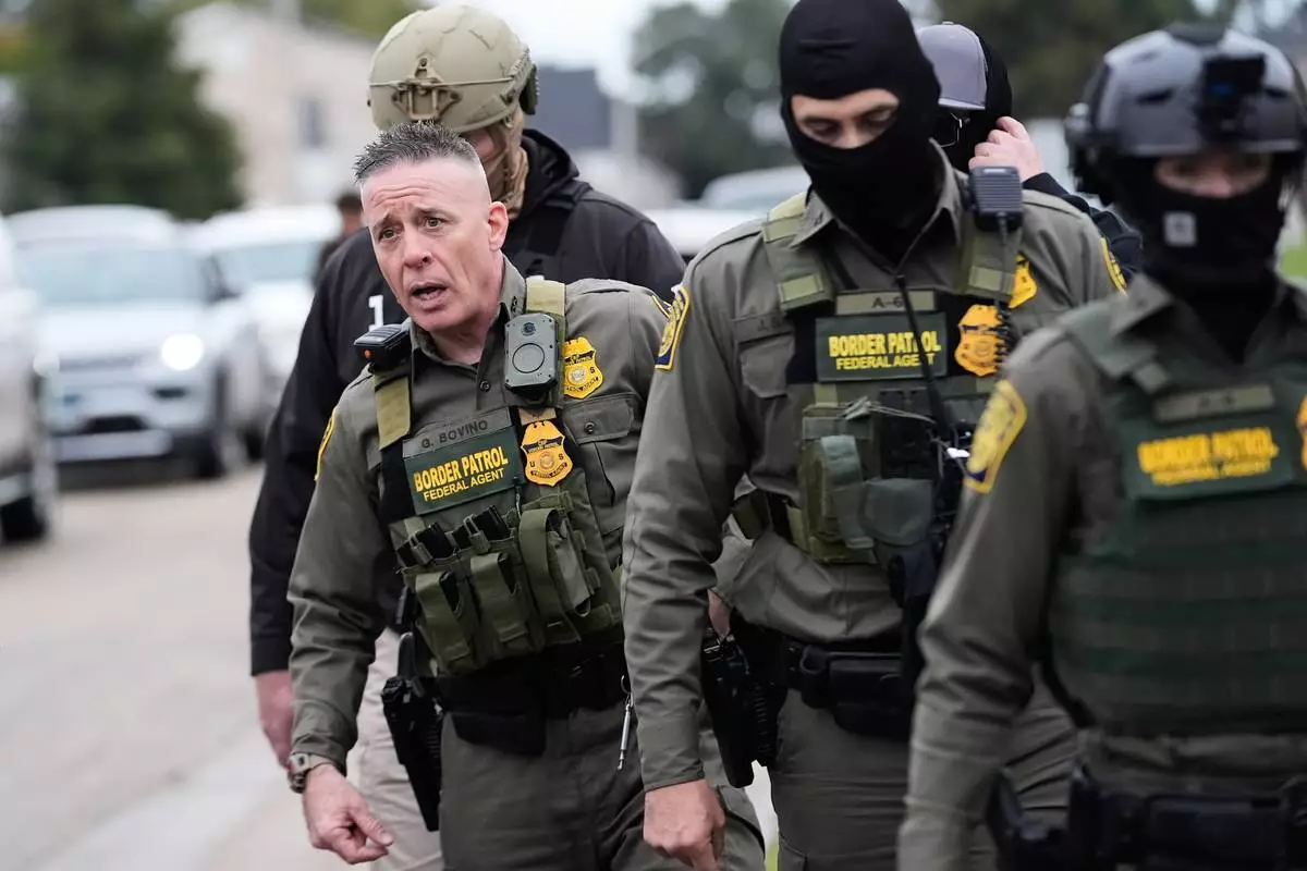 Customs and Border Patrol commander Gregory Bovino walks with border patrol agents through a neighborhood during an immigration crackdown, in Kenner, La., Friday, Dec. 5, 2025. (AP Photo/Gerald Herbert)