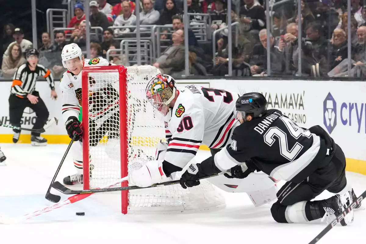 Los Angeles Kings center Phillip Danault, right, tries to get a shot in as Chicago Blackhawks defenseman Connor Murphy, left, and goaltender Spencer Knight defend during the second period of an NHL hockey game Thursday, Dec. 4, 2025, in Los Angeles. (AP Photo/Mark J. Terrill)