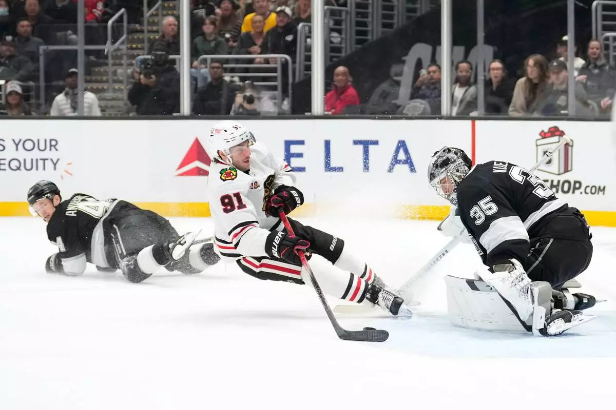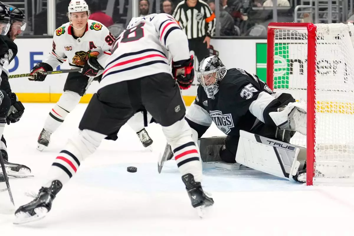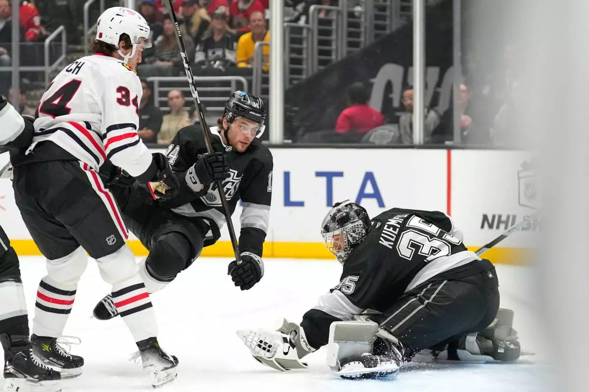 Chicago Blackhawks left wing Andre Burakovsky, center, tries to get a shot past Los Angeles Kings goaltender Darcy Kuemper during the first period of an NHL hockey game Thursday, Dec. 4, 2025, in Los Angeles. (AP Photo/Mark J. Terrill)