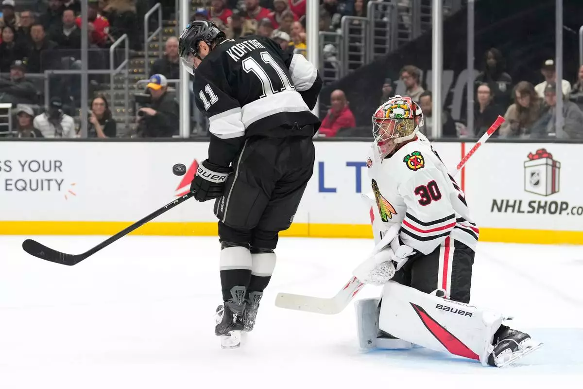 Los Angeles Kings center Anze Kopitar, left, tries to tip a shot past Chicago Blackhawks goaltender Spencer Knight during the second period of an NHL hockey game Thursday, Dec. 4, 2025, in Los Angeles. (AP Photo/Mark J. Terrill)