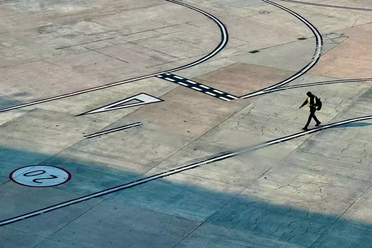 An airport official walks near a runway at the Indira Gandhi International Airport in New Delhi as several Indigo Airlines flights were cancelled or delayed, India, Thursday, Dec. 4, 2025. (AP Photo/Manish Swarup)