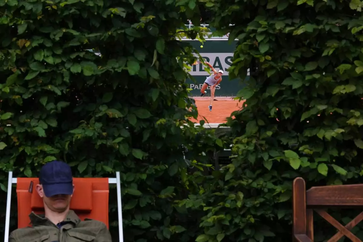 A spectator takes a nap next to a court of the French Tennis Open, at the Roland-Garros stadium, in Paris, May 29, 2025. (AP Photo/Lindsey Wasson, File)