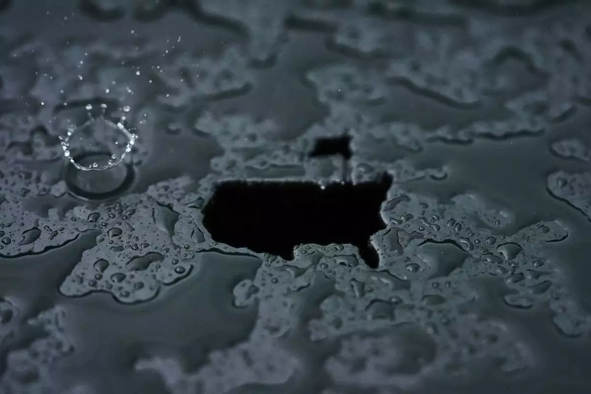 A rain droplet falls on a Masters logo cut out during a practice round at the Masters golf tournament, April 7, 2025, in Augusta, Ga. (AP Photo/Matt Slocum, File)