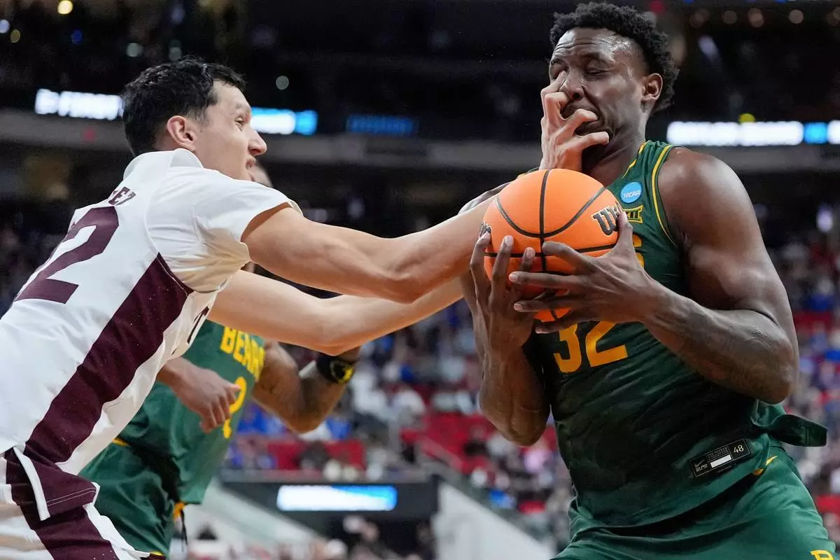 Baylor guard Jalen Celestine (32) is fouled by Mississippi State forward RJ Melendez, left, during the first half in the first round of the NCAA college basketball tournament, March 21, 2025, in Raleigh, N.C. (AP Photo/Stephanie Scarbrough, File)