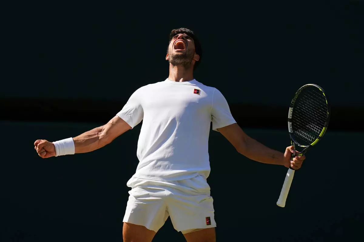 Carlos Alcaraz of Spain celebrates winning the men's semifinal singles match against Taylor Fritz of the U.S. at the Wimbledon Tennis Championships in London, July 11, 2025.(AP Photo/Kirsty Wigglesworth, File)