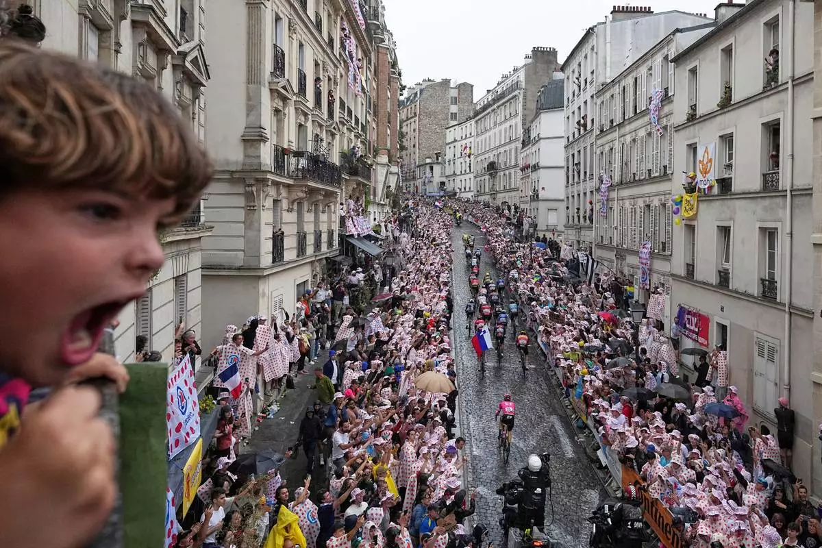 A boy shouts as the pack rides up the Montmartre hill during the last stage of the Tour de France cycling race between Mantes-la-Ville and Paris, July 27, 2025 in Paris (AP Photo/Laurent Cipriani, File)