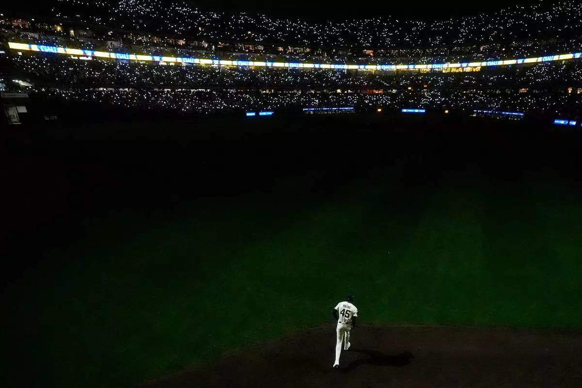 Los Angeles Dodgers' Shohei Ohtani watches his RBI-Double against the Toronto Blue Jays during the fifth inning in Game 3 of baseball's World Series, Oct. 27, 2025, in Los Angeles. (AP Photo/Mark J. Terrill, File)
