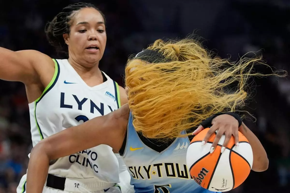 Chicago Sky forward Angel Reese, right, works toward the basket as Minnesota Lynx forward Napheesa Collier defends during the second half of a WNBA basketball game , July 22, 2025, in Minneapolis. (AP Photo/Abbie Parr, File)