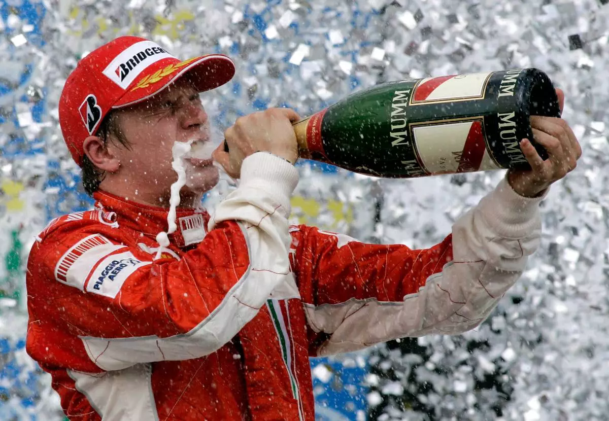 FILE - In this Oct. 21, 2007 file photo, Ferrari's driver Kimi Raikkonen of Finland celebrates after winning the Brazilian Formula One Grand Prix at the Interlagos race track in Sao Paulo, Brazil. (AP Photo/Ricardo Mazalan, File)