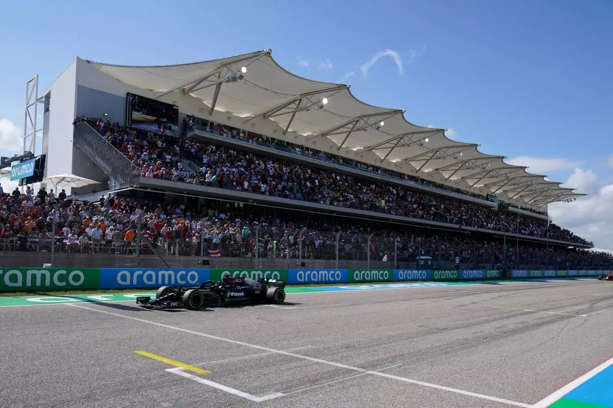 Mercedes driver Lewis Hamilton, of Britain, races past the grand stand followed by Red Bull driver Max Verstappen, of the Netherlands, during for the F1 U.S. Grand Prix auto race at the Circuit of the Americas, Oct. 24, 2021, in Austin, Texas. (AP Photo/Darron Cummings, Pool)