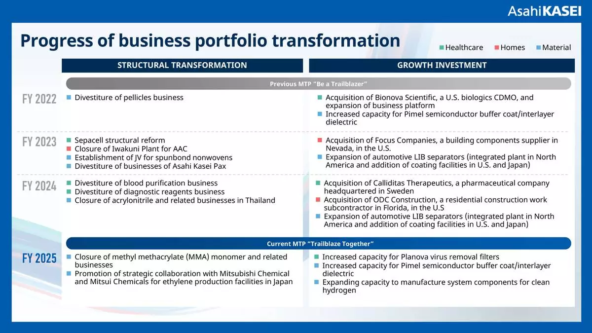 Under its three-year medium-term management plan "Trailblaze Together," Asahi Kasei is improving capital efficiency and accelerating earnings by converting past growth investments into tangible returns. To support this, the company is implementing structural reforms that channel resources to its key growth pillars—pharmaceuticals, critical care, overseas homes, and electronics.