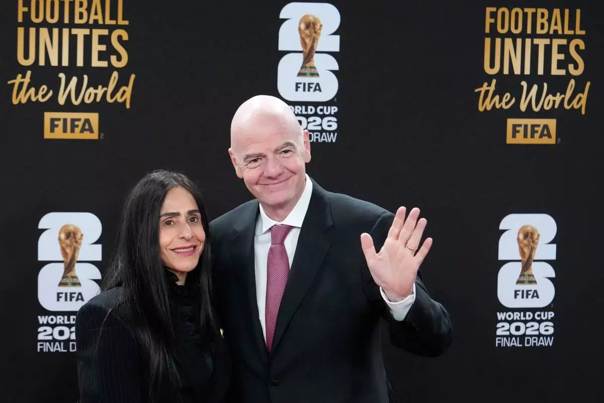 FIFA President Gianni Infantino and his wife Leena Al Ashqar pose for a photo as they arrive for a welcome reception ahead of the draw for 2026 soccer World Cup at the Kennedy Center in Washington, Thursday, Dec. 4, 2025. (AP Photo/Chris Carlson)