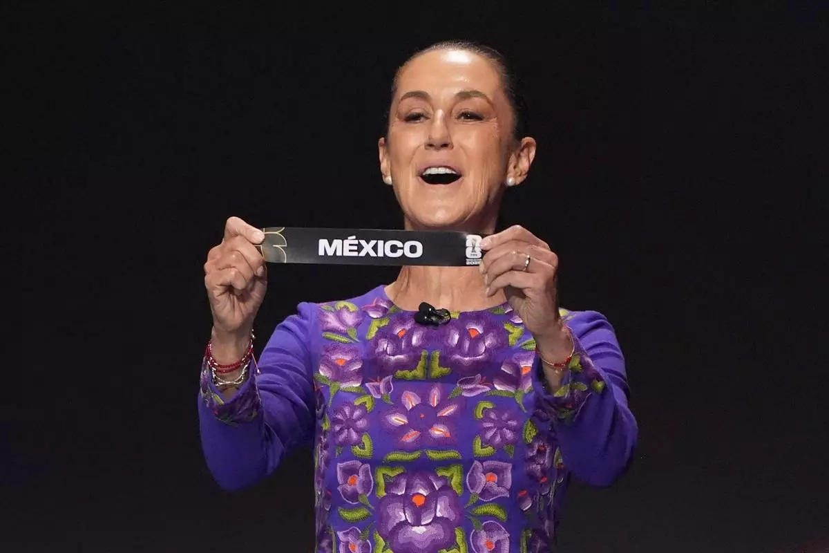 Mexican President Claudia Sheinbaum holds up the team name of Mexico during the draw for the 2026 soccer World Cup at the Kennedy Center in Washington, Friday, Dec. 5, 2025.(AP Photo/Evan Vucci)