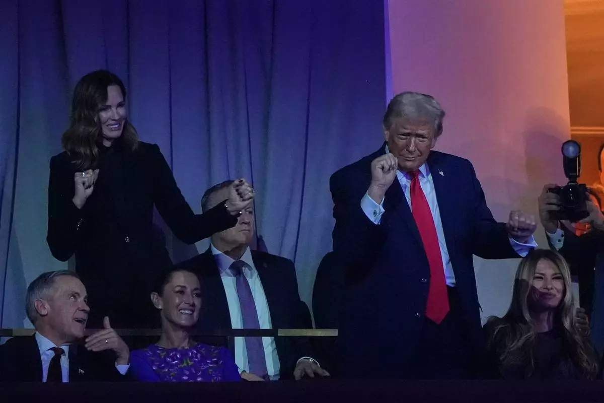 President Donald Trump dances to The Village People as Canadian Prime Minister Mark Carney, Mexican President Claudia Sheinbaum and First Lady Melania smile during the draw for the 2026 soccer World Cup at the Kennedy Center in Washington, Friday, Dec. 5, 2025. (AP Photo/Jacquelyn Martin)