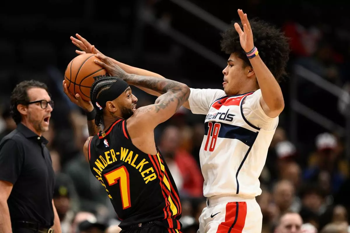 Washington Wizards forward Kyshawn George (18) pressures Atlanta Hawks guard Nickeil Alexander-Walker (7) during the first half of an NBA basketball game, Saturday, Dec. 6, 2025, in Washington. (AP Photo/Nick Wass)