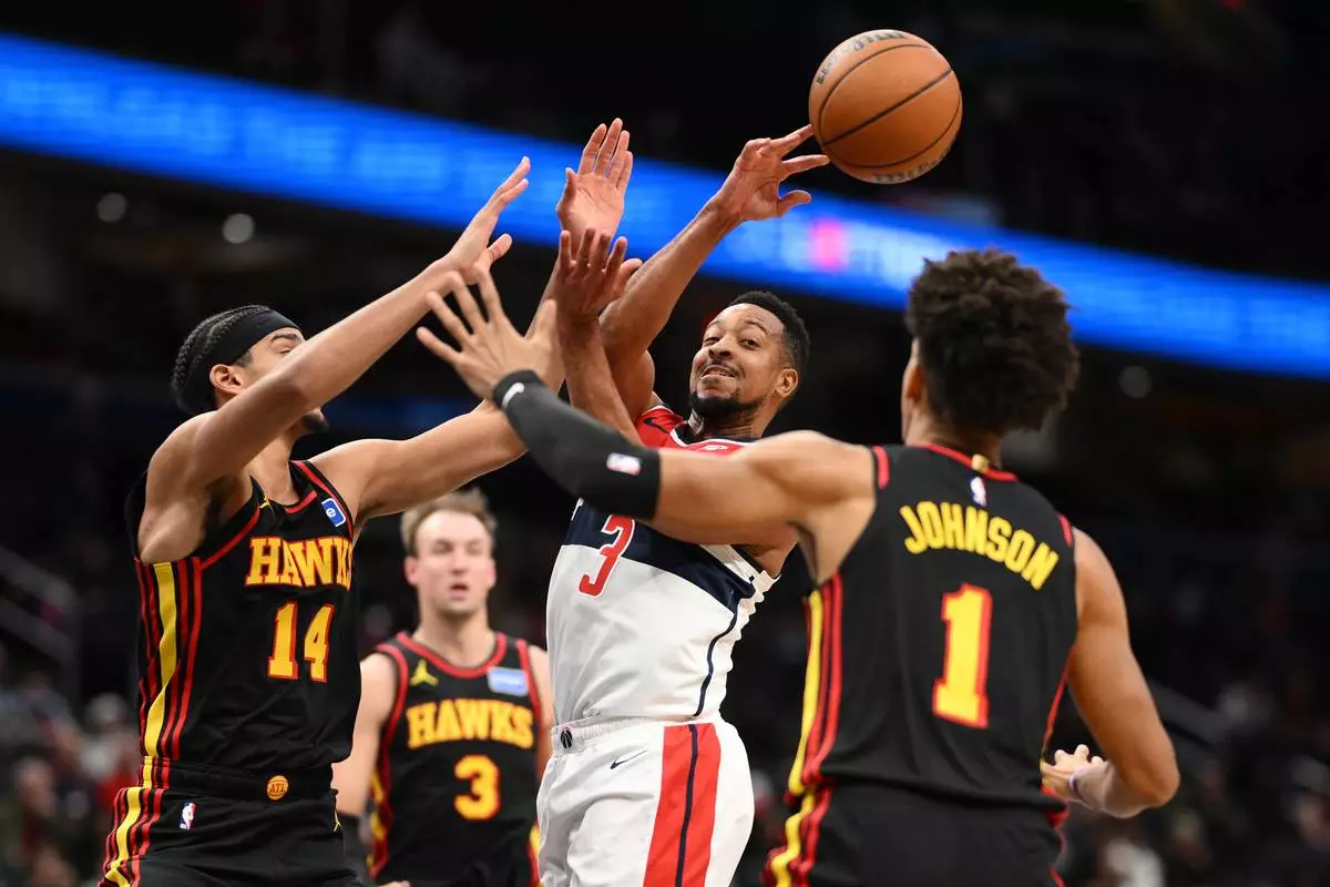 Washington Wizards guard CJ McCollum (3) passes the ball against Atlanta Hawks forward Asa Newell (14), forward Jalen Johnson (1) and guard Luke Kennard (3) during the first half of an NBA basketball game, Saturday, Dec. 6, 2025, in Washington. (AP Photo/Nick Wass)