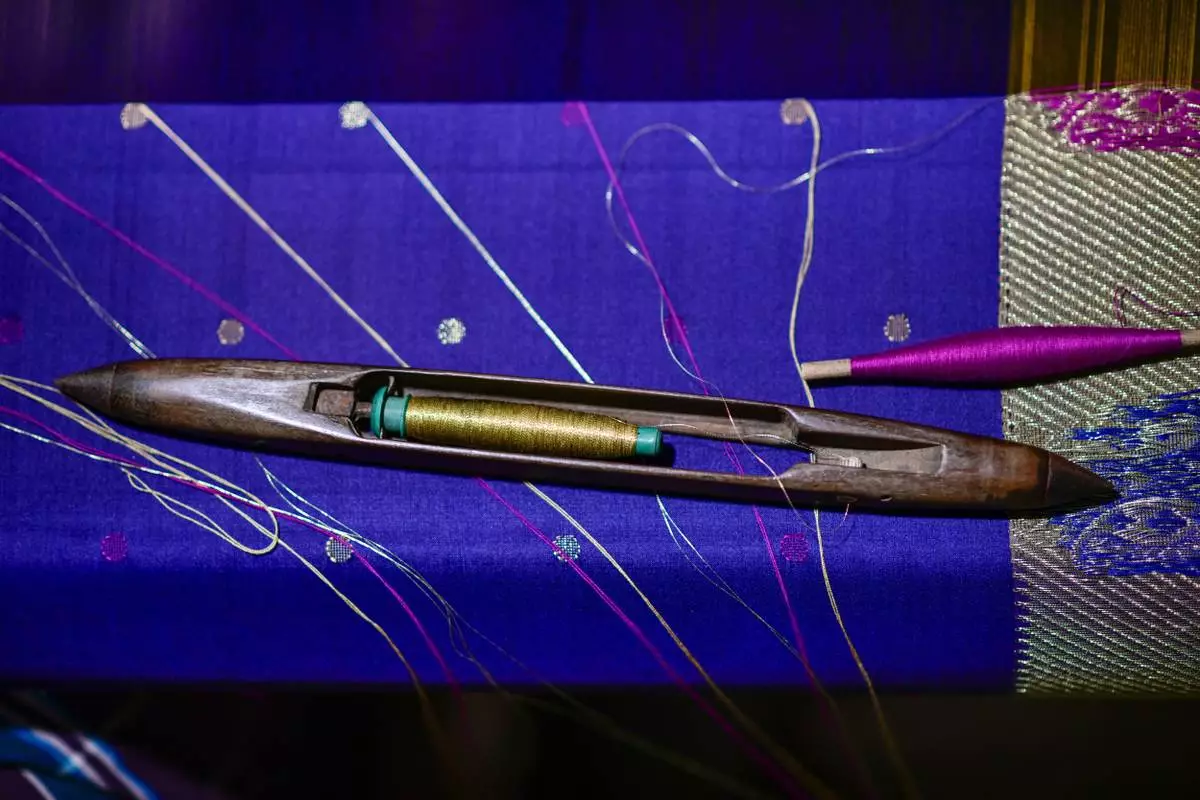 A shuttle holding the weft thread is seen on a hand-operated loom, which is used to create the renowned Tangail sarees at a traditional weaving workshop in Tangail District, Bangladesh, Nov. 5, 2025. (AP Photo/Mahmud Hossain Opu)