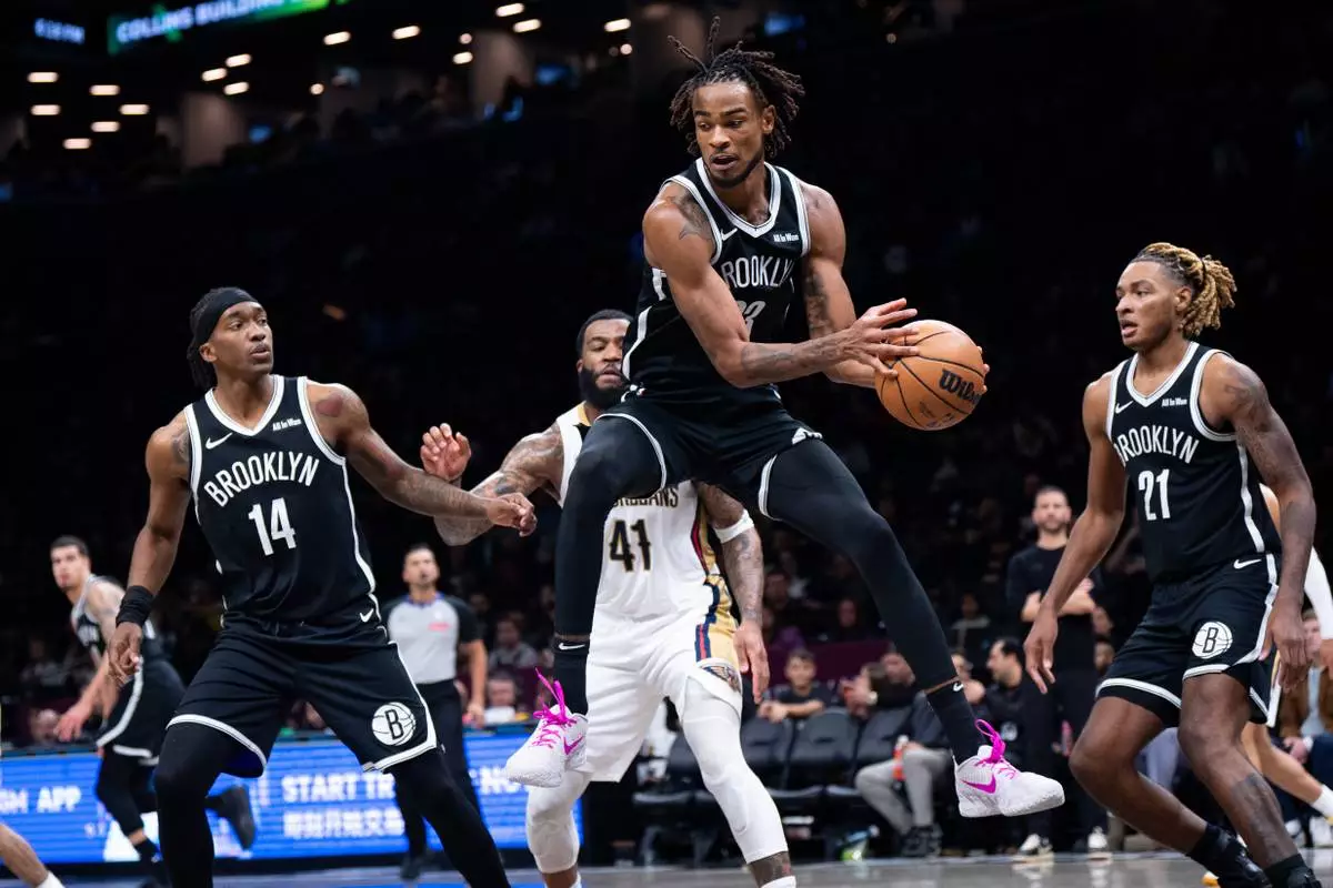 Brooklyn Nets center Nic Claxton, top, catches the ball during the second half of an NBA basketball game against the New Orleans Pelicans, Saturday, Dec. 6, 2025, in New York. (AP Photo/Angelina Katsanis)