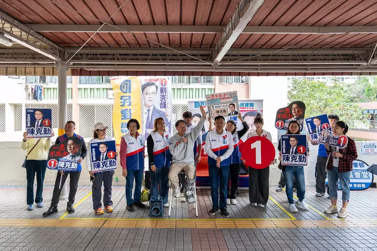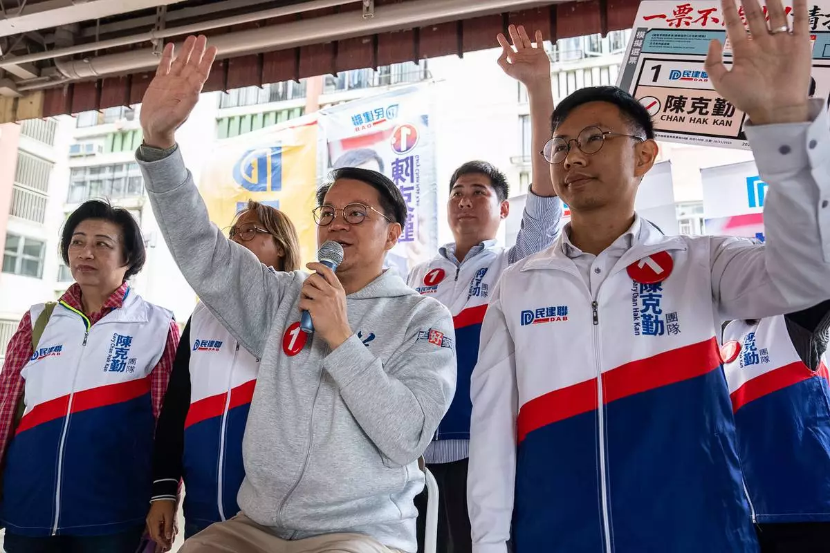 Gary Chan, candidates of the Legislative Council Election, center, campaigns on the street during the Legislative Council General Election in Hong Kong on Sunday, Dec. 7, 2025. (AP Photo/Chan Long Hei)