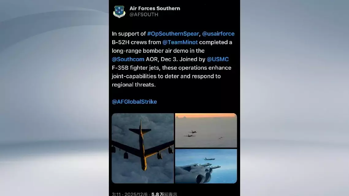 On Friday, U.S. Air Forces Southern announced in a social media post that B-52H crews from Minot Air Force Base conducted a long-range air demonstration mission on Wednesday alongside Marine Corps F-35B fighters within the U.S. Southern Command's Area of Responsibility, aiming to enhance joint deterrence and respond to regional threats.