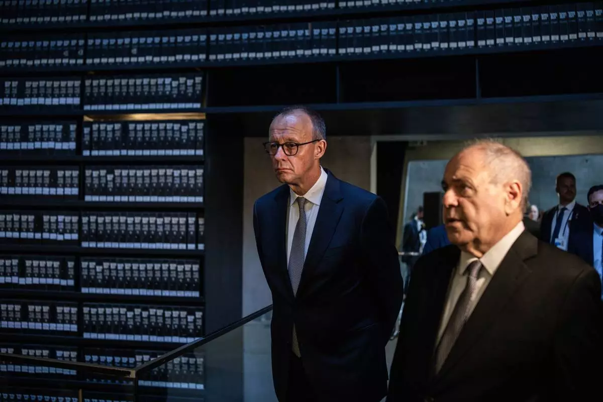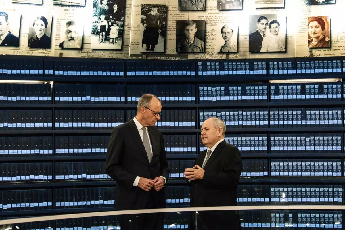German Chancellor Friedrich Merz, left, stands by Dani Dayan Dani Dayan, chairman of the Yad Vashem Holocaust Memorial Museum, at the museum's Hall of Names in Jerusalem, Sunday, Dec. 7, 2025. (John Wessels, Pool Photo via AP)