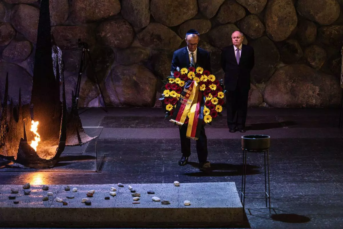 German Chancellor Friedrich Merz, left, stands by Dani Dayan Dani Dayan, chairman of the Yad Vashem Holocaust Memorial Museum, at the museum's Hall of Names, in Jerusalem, Sunday, Dec. 7, 2025. (John Wessels, Pool Photo via AP)