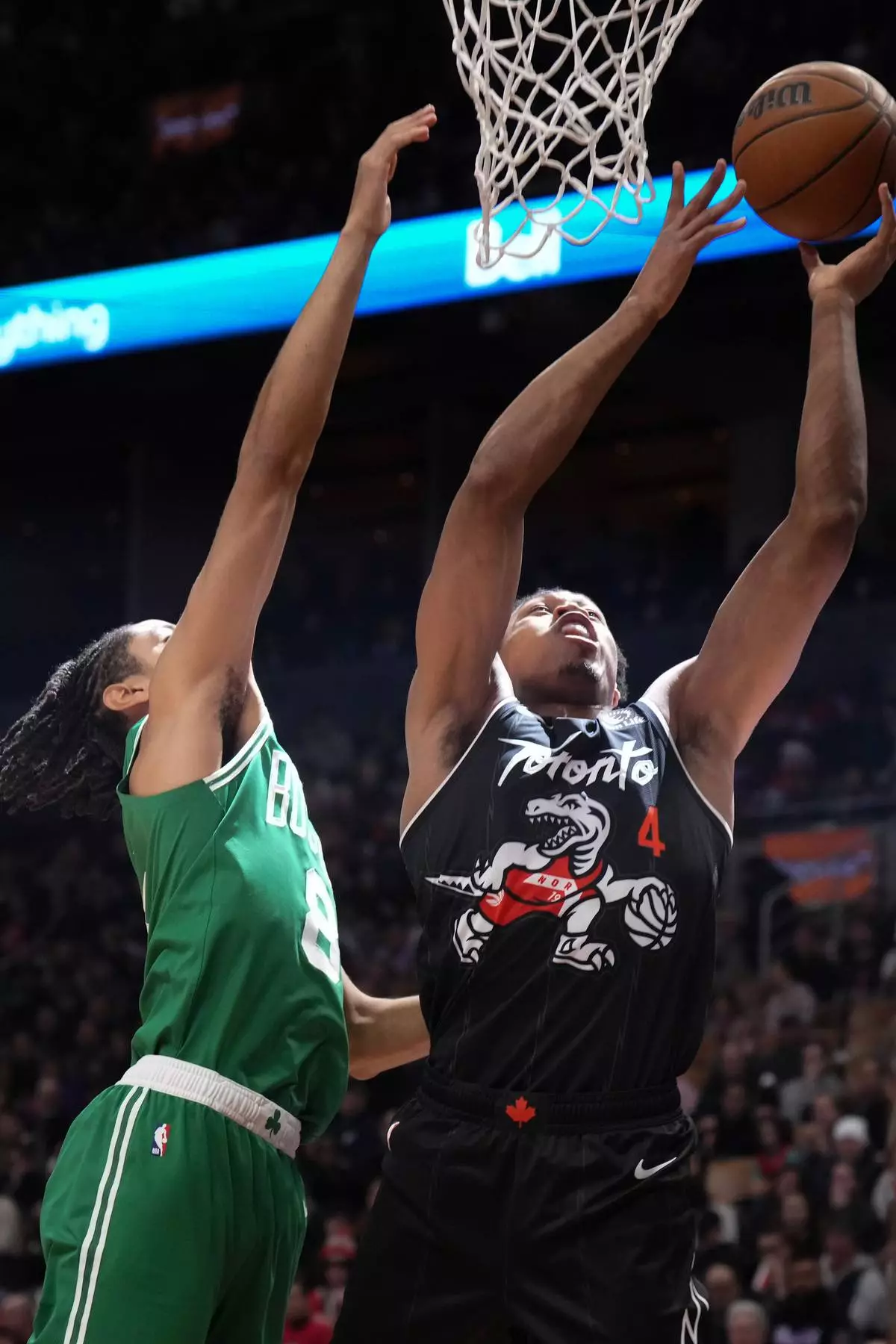 Toronto Raptors forward Scottie Barnes (4) tries for a layup as Boston Celtics forward Josh Minott (8) tries to block him out during first-half NBA basketball game action in Toronto, Sunday Dec. 7, 2025. (Chris Young/The Canadian Press via AP)