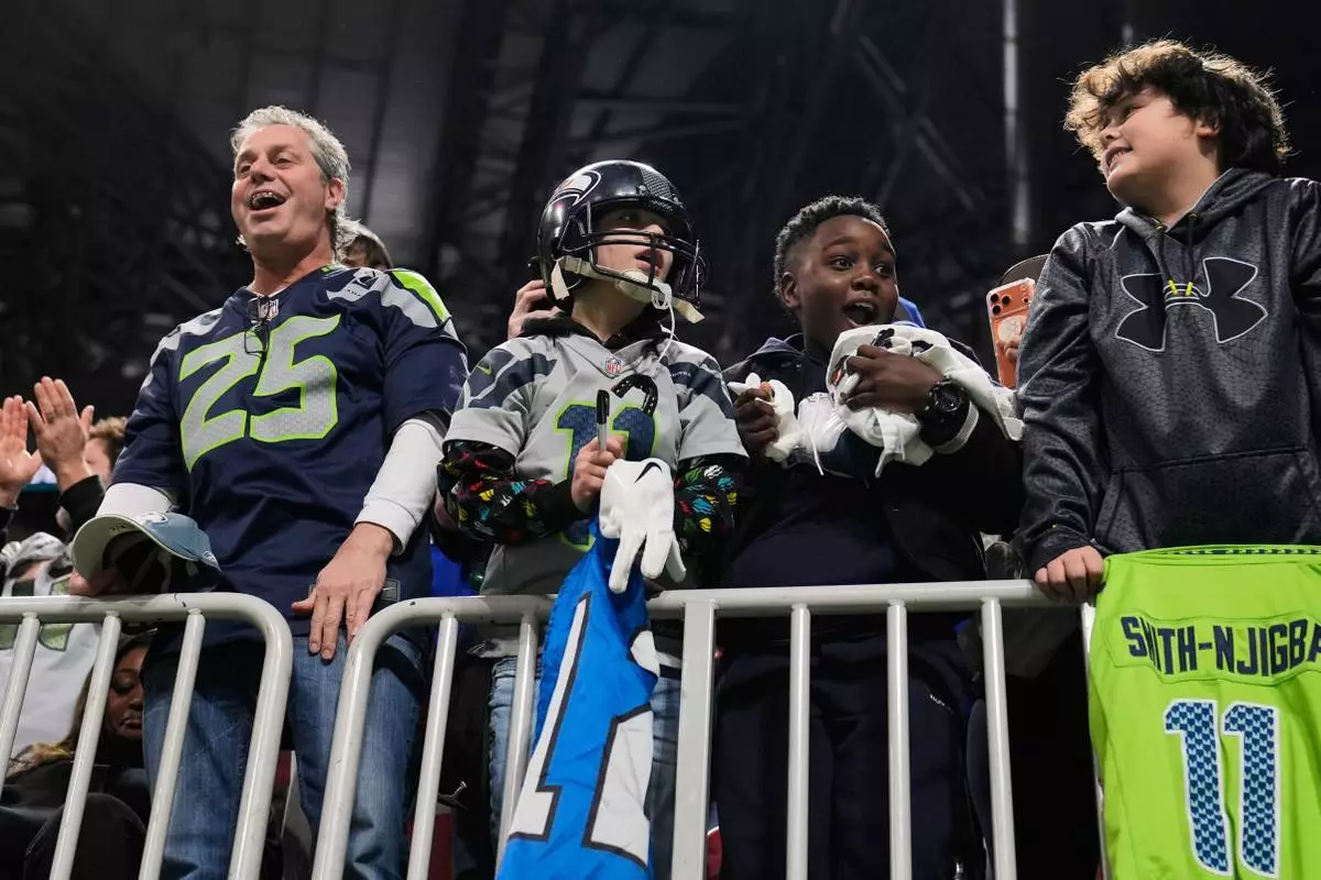 Fans react after getting gloves from Seattle Seahawks wide receiver Rashid Shaheed after an NFL football game against the Atlanta Falcons, Sunday, Dec. 7, 2025, in Atlanta. (AP Photo/Brynn Anderson)