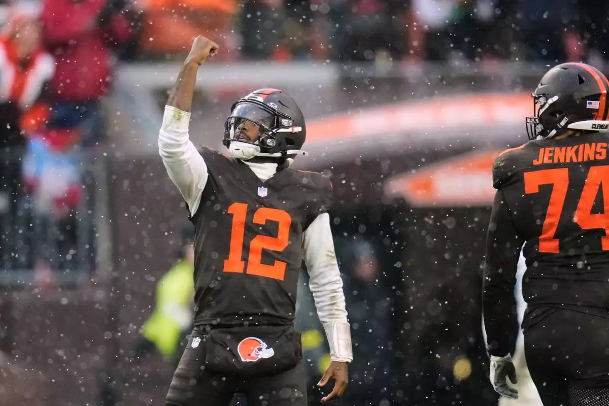 Cleveland Browns' Shedeur Sanders (12) and Teven Jenkins (74) celebrate a touchdown in the first half of an NFL football game against the Tennessee Titans in Cleveland, Sunday, Dec. 7, 2025. (AP Photo/Sue Ogrocki)