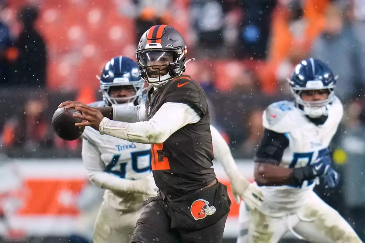 Cleveland Browns quarterback Shedeur Sanders (12) throws a pass under pressure from Tennessee Titans defenders in the second half of an NFL football game in Cleveland, Sunday, Dec. 7, 2025. (AP Photo/Sue Ogrocki)