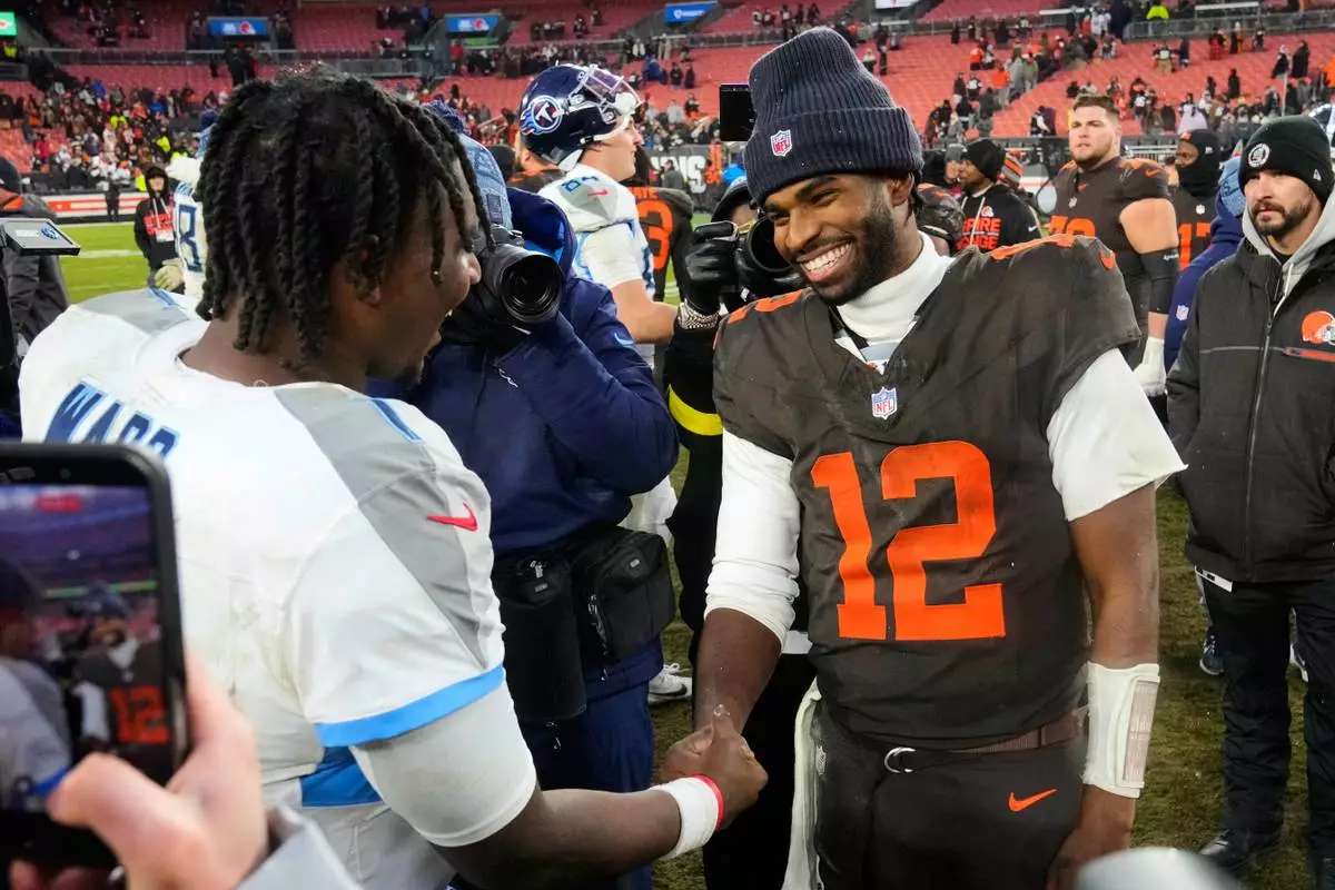 Tennessee Titans quarterback Cam Ward, left, and Cleveland Browns quarterback Shedeur Sanders (12) greet each other after an NFL football game in Cleveland, Sunday, Dec. 7, 2025. (AP Photo/Sue Ogrocki)