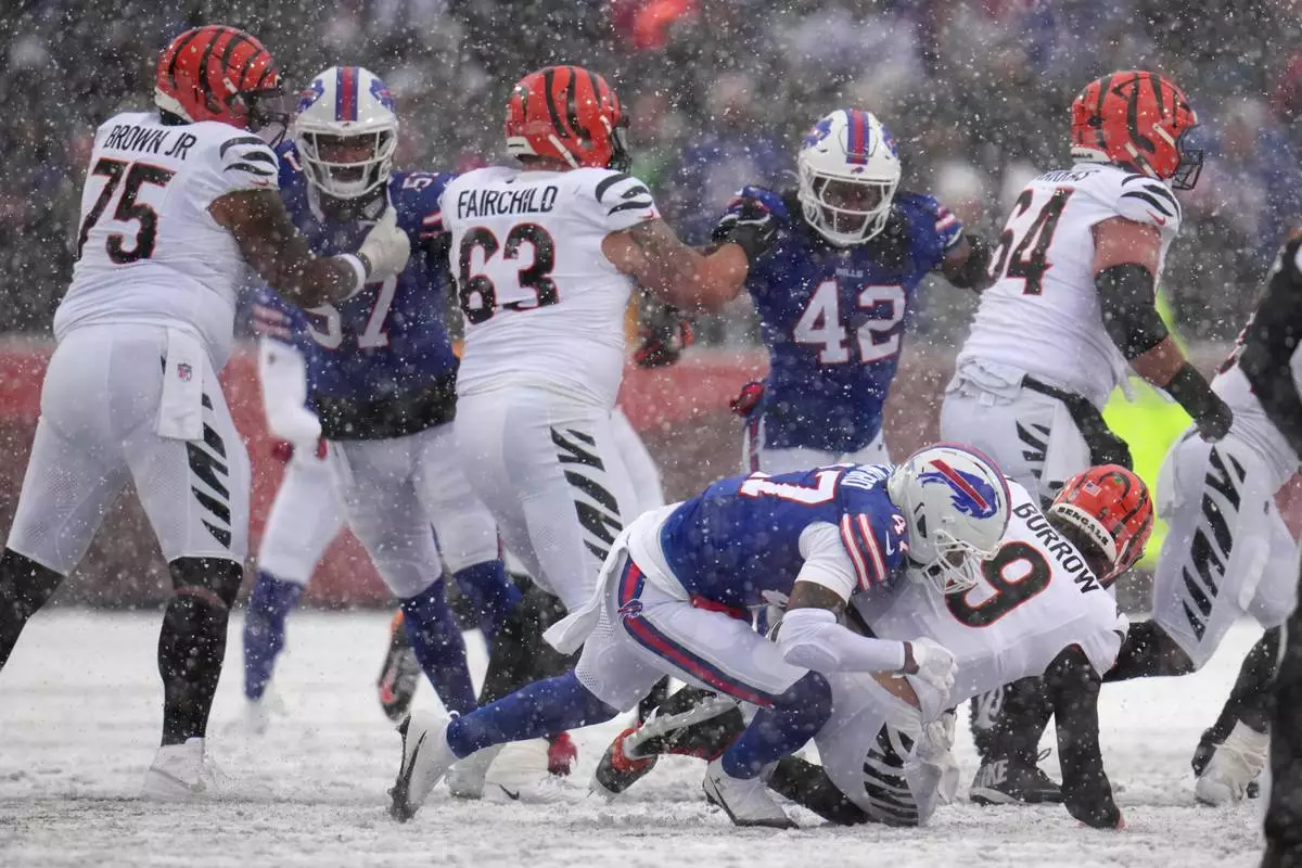 After Josh Allen ran for a 40-yard touchdown to get Buffalo within three, Burrow threw interceptions on consecutive snaps from scrimmage. The first was returned 63 yards for a touchdown by Christian Benford, who leaped to pick off Burrow's lob attempt to Ja’Marr Chase.