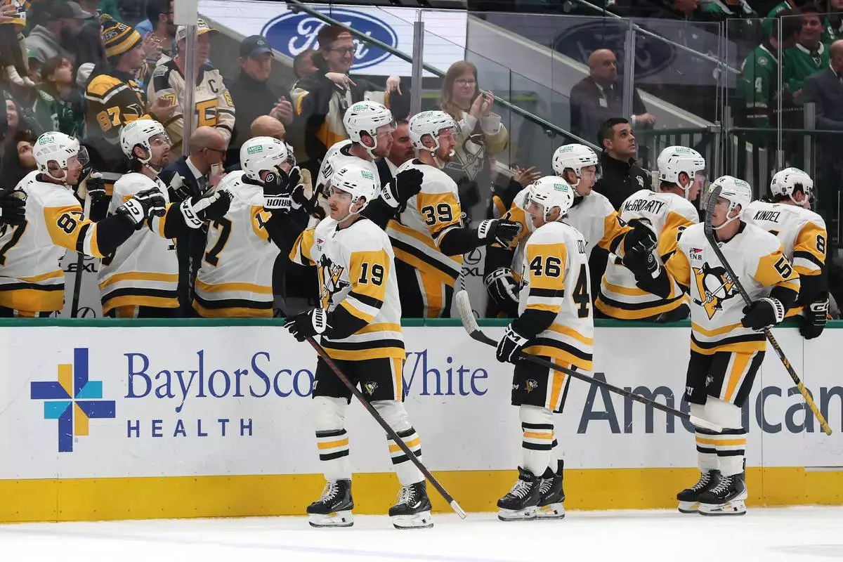 Pittsburgh Penguins center Connor Dewar (19) is congratulated by teammates on his bench after scoring a goal against the Dallas Stars during the first period of an NHL hockey game Sunday, Dec. 7, 2025, in Dallas. (AP Photo/Sam Hodde)