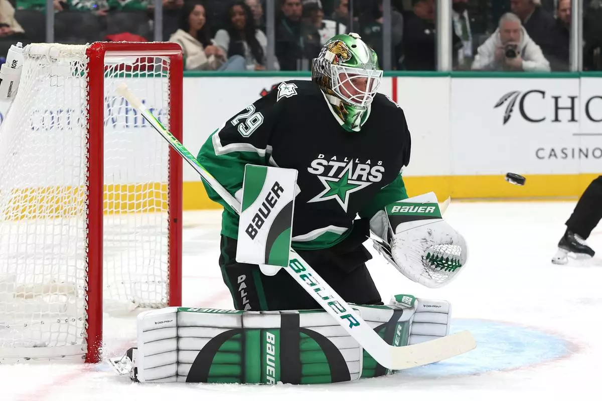 Dallas Stars goaltender Jake Oettinger blocks a shot during the second period of an NHL hockey game against the Pittsburgh Penguins, Sunday, Dec. 7, 2025, in Dallas. (AP Photo/Sam Hodde)