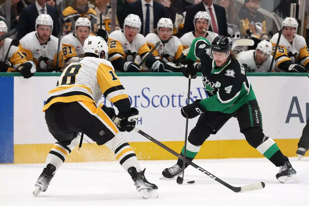 Dallas Stars defenseman Miro Heiskanen (4) is defended by Pittsburgh Penguins center Tommy Novak (18) during the first period of an NHL hockey game Sunday, Dec. 7, 2025, in Dallas. (AP Photo/Sam Hodde)