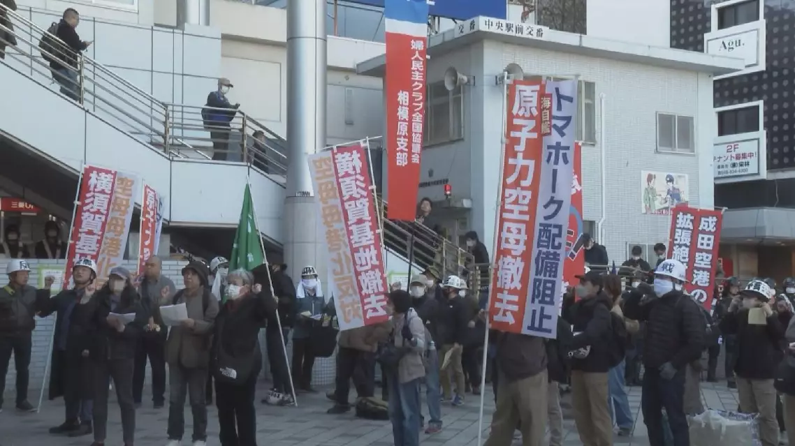 Participants in the rally also held signs that read "Remove Yokosuka Base" and "Remove Nuclear-Powered Aircraft Carrier" in protest against the presence of the U.S. naval base in the area.