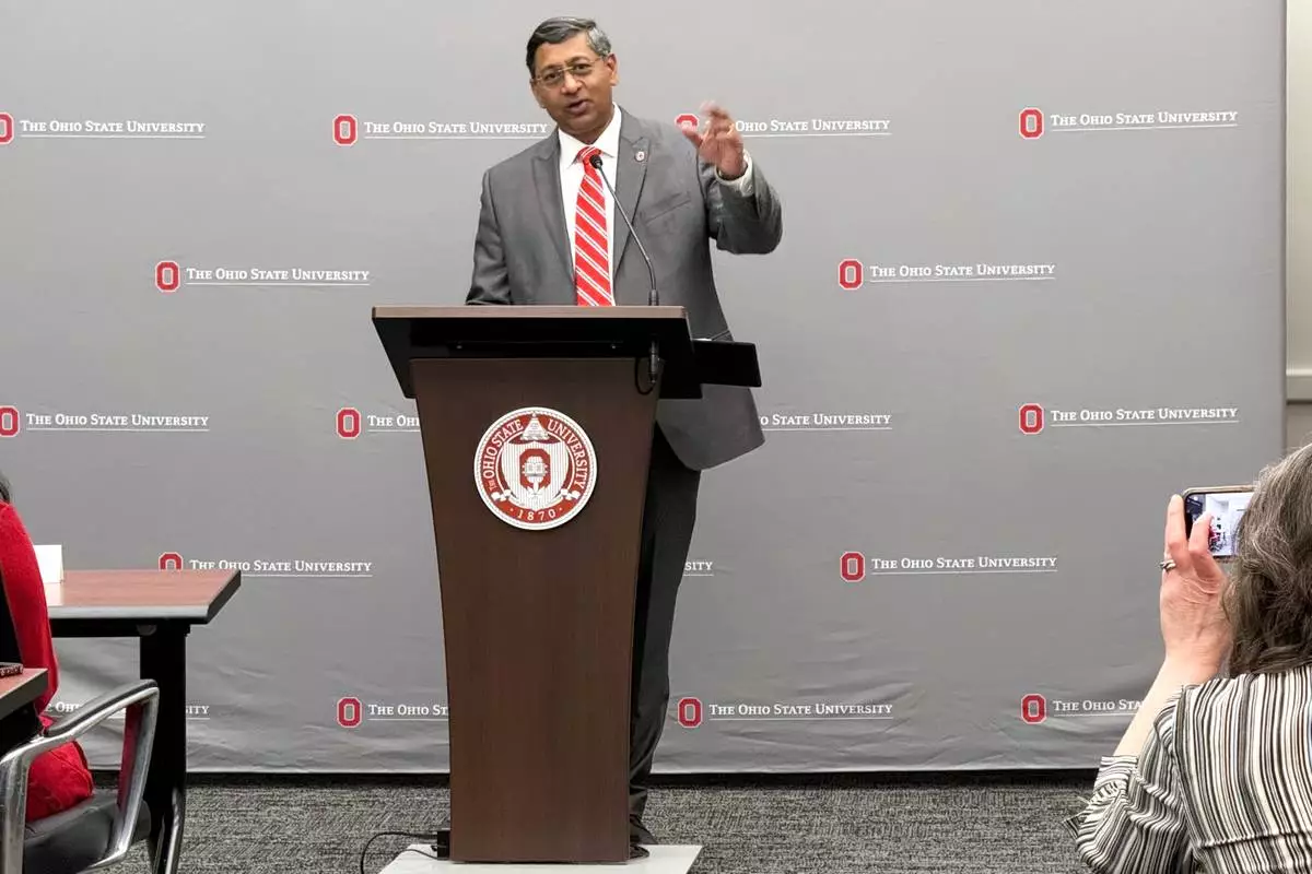 New Ohio State University President Ravi Bellamkonda speaks at the university on Thursday, March 12, 2026, in Columbus, Ohio. (AP Photo/Patrick Aftoora-Orsagos)