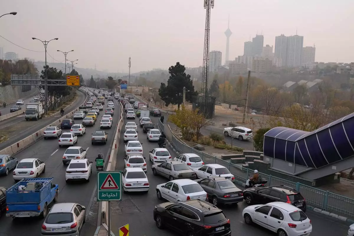Cars drive in an afternoon traffic jam in a high air pollution in Tehran, Iran, Sunday, Dec. 7, 2025. (AP Photo/Vahid Salemi)